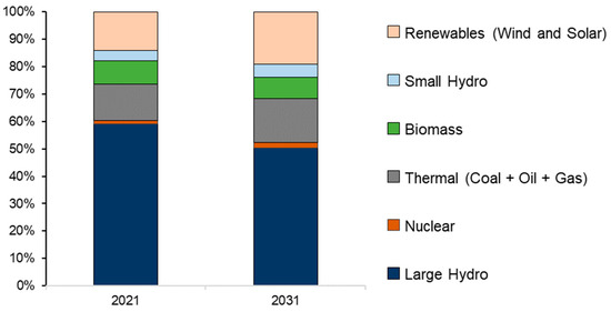 Historically hydro-dominated, it features large reservoirs providing multi-year regulation capabilities. These large hydro plants are organized in complex cascades across various river basins. Large-scale hydro power accounted for 59% of the installed capacity in 2021, followed by 15% from thermal plants and 26% from other renewables, of which 14% were variable renewables. Brazilian official energy planning projects a decline in the participation of large hydro plants to 50% over a ten-year horizon, while variable renewables are expected to increase to 19% of the total centralized installed capacity of the system (Figure 1). In Brazil, continuous and disruptive technological innovation leads to an increased participation of new non-controllable renewable sources (mainly wind and solar photovoltaic), with a reduction in the prevalence of hydroelectricity [9].