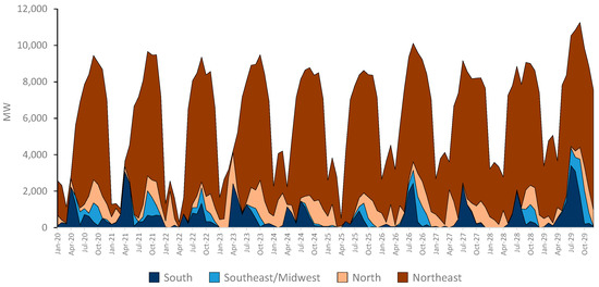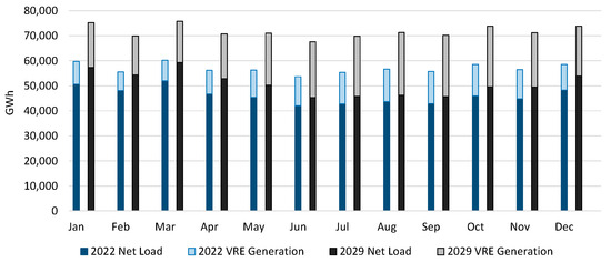 This analysis encompasses the government’s electricity expansion plan until 2029 [30], defined by a mixed-integer programming optimization model [31]. The objective function is to reduce the expected value of the total investment and operation expansion cost, considering all available generation projects in the Brazilian power system. The resulting matrix in this case depicts a substantial expansion of variable renewables, practically doubling VRE generation from 2022 to 2029, as observed in Figure 2. Moreover, the significant energy that is supplied by renewables that is indicated in this case can lower the monthly net load (defined as load after deducting VRE generation). This condition is particularly noticeable when wind generation performs optimally, mainly during Brazil’s dry season (between May and November). In times of scarce water, causing electricity prices to spike, wind generation alleviates pressure on hydro generation, thereby favoring hydroelectric storage [32].