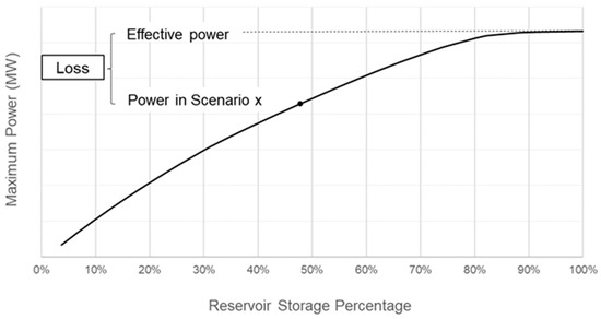 The primary objective is to quantify the losses associated with each stage and identify the reservoirs where the greatest losses occur. This assessment aims to determine if it is possible to maximize capacity availability. The first step calculates the loss due to reservoir depletion, representing the difference between effective power and available power associated with the reservoir level (Figure 3). This process is repeated for all simulated scenarios throughout the study horizon.