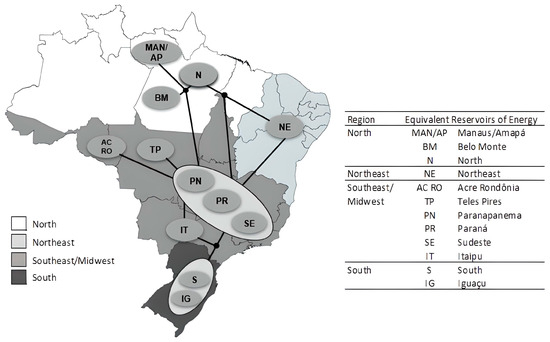 Given the complexity of operation optimization and the abundance of reservoirs in the Brazilian system, the NEWAVE model simplifies the problem by aggregating hydro plants in the same or similar river basins into equivalent energy reservoirs, as depicted in Figure 4.
