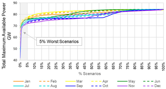 After completing the two-step calculation, the maximum available power (PmaxAv) for all plants “p” is aggregated to determine the overall system capacity for each month across the 2000 simulated hydrological scenarios. Using these values, we calculate the Conditional Value at Risk (CVaR) for the 5% worst scenarios of each month, providing a measure of power availability losses in these challenging situations, as illustrated in Figure 6.