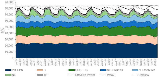 The proposed methodology aims to assess the potential maximization of hydroelectric plants’ available power to meet capacity requirements and identify key reasons for significant power losses. Figure 7 displays the Hydro Maximum Available Power (PmaxAv) for the 5% worst hydraulic scenarios (CVaR5%) across all Brazilian regions. Regions such as PR + PN (Paraná + Paranapanema), Itaipu, SE + AC/RO (Sudeste + Acre Rondônia), and Teles Pires, previously presented in Figure 4, represent equivalent energy reservoirs in the optimization model for the Southeast/Midwest region.