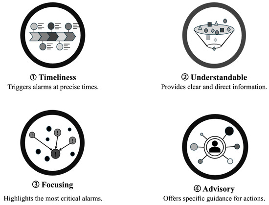 Then, what criteria should be satisfied by the appropriate alarm processing required to respond to such abnormal system situations? The literature has proposed that the role and characteristics of alarms be communicated from the alarm system to the operator as criteria for appropriate alarm processing [17,23,24]. The alarm processing functions proposed in the literature can be summarized by the four representations in Figure 2 below.