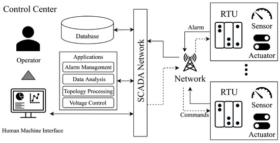 The operator’s commands, informed by the HMI data, are inputted back into the SCADA system. These commands are subsequently relayed to each RTU across the system, which executes the control actions [29,30,31]. This sequence demonstrates how modern power systems leverage synchronized wide-area communication to enable effective management through real-time interaction between substations and various control systems [32]. This structured interoperation ensures that alarms are triggered accurately and that necessary responses are initiated in a timely fashion, maintaining system stability and efficiency.