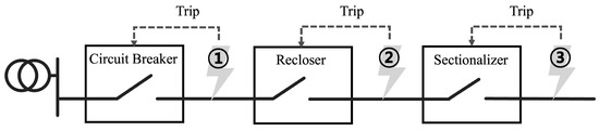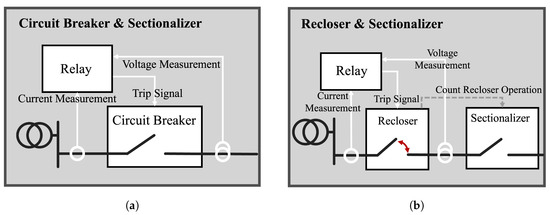 The operational linkage of the recloser and sectionalizer is shown in Figure 4b. A recloser differs from a one-time grid isolator, such as a CB, in that it repeats a certain number of opening and closing operations. Reclosers are characterized by initially disconnecting the grid upon detecting a fault current and then reconnecting the grid after some time. This feature is designed to assume a temporary fault. Once the fault is resolved during the opening and closing operation, the recloser reconnects the grid without further opening and closing to restore the original operating state. On the other hand, if a fault is detected even after multiple opening and closing operations, the recloser will open the grid permanently to isolate the faulted section from the system and prevent the fault from spreading. The sectionalizer counts the number of open and close operations of the recloser and opens the line if it detects more than a set number of operations. Sectionalizers do not directly block faults, but their simple operation and low cost make them effective in conjunction with reclosers to minimize fault propagation [35].