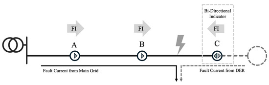 More recently, bidirectional FIs have been used instead of traditional unidirectional FIs due to distributed power sources. This is illustrated by the grey circular dotted line in the figure. A fault between B and C will also generate a fault current from the power source to the fault point in a few situations. If the FI at point C cannot detect the downstream fault current, then the candidate fault location will be inferred to be between B and C or between C and the power source. However, if the FI at point C can detect the bidirectional fault current, then the fault location can be confirmed to be between B and C.