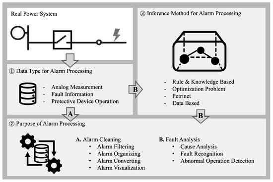 The primary purpose of alarm processing is to support system operators. There have been many research studies on alarm processing in which, in the narrowest sense, alarm processing methods focus on supporting the operators by removing, cleaning, transforming, or visualizing the alarm data rather than deriving new insights from said data. However, more comprehensively, alarm processing involves inferring meaningful information from the data, such as finding the location and the cause of a fault or identifying malfunctions in system devices, information which is then delivered to the system operator. Thus, the outcomes of alarm processing can vary significantly depending on the designer’s preferences and objectives, the types of data utilized, and the methodologies applied.