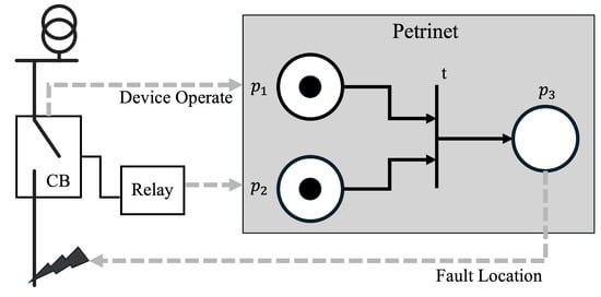 Figure 8 depicts a partial representation of a petrinet, which describes the simplest example of a petrinet that represents the failure of a particular line based on the behavior of a protective device. As a fundamental example, consider the case where a fault triggers a relay, which in turn triggers a CB. If a token exists at , which is a place corresponding to a specific relay, and a failure at a specific location causes a token to be created at , then at transition t, a token is created at because tokens exist at both input places. If this is set as a CB triggered by the relay, then the sequence of protector actions due to a fault can be modeled.