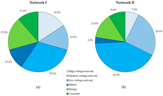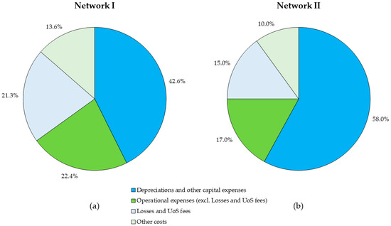 Proportions of each cost category from total costs (excl. rate of return) in (a) Network I and (b) Network II.