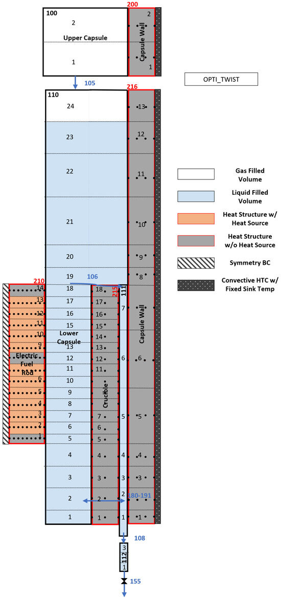 The OPTI-TWIST (Out-of-Pile Testing and Instrumentation Transient Water Irradiation System) is an electrically heated system to prototype TWIST, a nuclear fuel test vehicle. OPTI-TWIST tests instrumentation that is used to qualify nuclear fuel under accident scenarios, like a loss-of-coolant accident (LOCA) or a reactivity insertion accident. Monitoring temperature through optimally placed TCs in OPTI-TWIST eliminates complications of irradiation effects while preserving extreme thermal-hydraulic conditions. A lumped-parameter code, the Reactor Excursion and Leak Analysis Program (RELAP5-3D) [43], was used to model the system’s thermal-hydraulic parameters under transient operation.