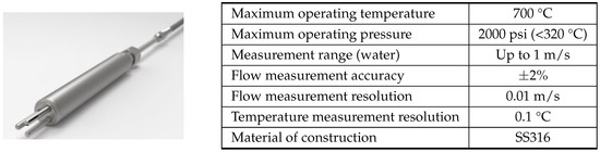 The Sporian ThermaFlow™ 700 sensor, refer to Figure 9, manufactured by Sporian Microsystems Inc. in Lafayette, CO, USA, is a velocity probe that can withstand the operating conditions of the SG. Its length can be manufactured according to user requirements and it is used to monitor flow distribution. The probe can perform both velocity and temperature measurements, and its technical specifications are summarized in Figure 9. An instrumentation port can be machined in the upper plenum for the sensor. The K- and N-type thermocouples (Figure 5) in the previous section are also used for temperature measurements within the SG. Pressure taps and fiber-optic sensors can be placed within SG tubes and shell to provide localized measurements (Figure 10). Heat flux can be measured through small square sensors that are mounted to the outer and/or inner surface of the SG wall (Figure 11).