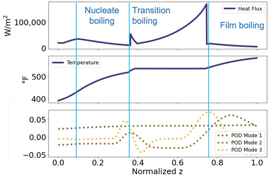 The relationship between the secondary-side temperature and heat flux () in the steam generator tubes was further analyzed. Optimized temperature sensors capture energy fluctuations in the POD modes. The leading POD mode represents the overall temperature profile, and the second and third modes capture the heat flux that causes the temperature variation (Figure 13). Heat flux, dependent on temperature gradients, can be estimated from TC-based temperature reconstructions outside the phase change region . During phase change, temperature gradients vanish, and the heat flux is determined by the latent heat coefficient and the mass of the substance undergoing phase change. Heat flux for the different boiling regions is calculated separately, resulting in abrupt changes between boiling regimes. Further analysis of time-dependent data can allow for the inference of heat flux from temperature measurements.