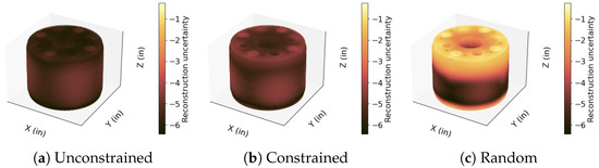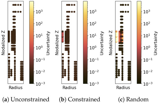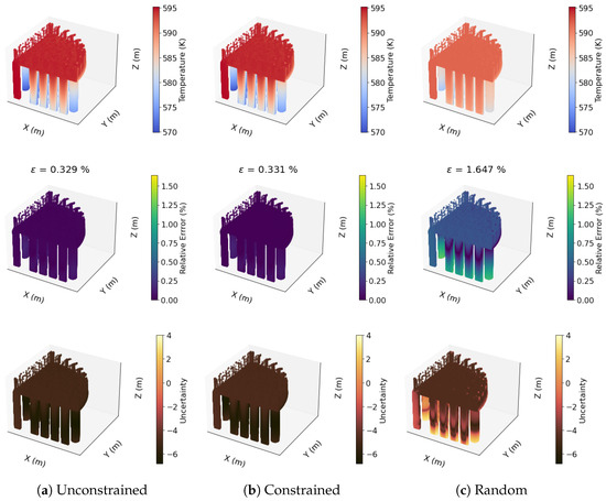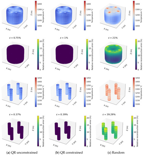 Optimized, unconstrained QR pivoting locates two sensors in the SG tubes (z < 1.828 m in Figure 14) and achieves a reconstruction error of . In contrast, constrained optimization places only one sensor in the tube while maintaining a comparable reconstruction error of (Figure 15a,b). Optimal sensor reconstructions outperform randomly placed sensor reconstructions which have a maximum error of (Figure 15c). In these figures, we reconstruct temperature profiles developed by the nominal mass flow rate = 1.2 m/s. Additionally, reconstruction errors decrease with increasing mass flow rate (Figure 16) due to reduced temperature variation at higher mass flow rates (brown dots in Figure 16). Ensembles of randomly located sensors (error bars in Figure 16) fail to accurately capture the temperature field across the SG. A similar trend is observed in noise-induced uncertainties, with QR-optimized sensors showing a maximum uncertainty of 0.010 °K, while random sensor placements result in uncertainties up to 20% (as shown in row 3 of Figure 15a–c).