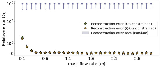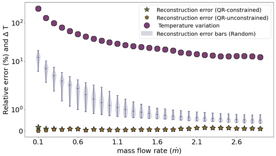 QR-optimized sensors capture temperature variance within the SG, leading to higher reconstruction accuracy across all mass flow rates compared to random sensor placement. Optimized sensors achieve low reconstruction errors (), and random placements result in larger errors (). Plot is shown on a symbolic log scale to highlight differences in reconstruction errors.