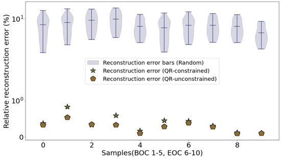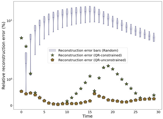 Constraints are introduced while choosing the next iterate by forcing the selected pivot column to lie within allowable column indices based on the constraints applied [42]. The algorithm handles region constraints where exactly or a maximum of s sensors are allowed in a particular constraint region and the remaining must be outside it. It can handle cases where a certain number of sensor locations s are predetermined and the remaining need to be optimized or adaptive distance constraints, where sensors must be located at a specific distance d apart from each other. These constraints are implemented in the final steps of the QR pivoting procedure, so as to allow upper triangularization of the first few terms of to proceed normally [42]. Thus, allowing the best sensors to be chosen in allowable regions at each iteration is the key driver of reconstruction accuracy. We evaluate the reconstruction accuracy through the relative reconstruction error (), where