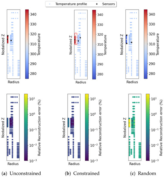 QR-optimized sensors reconstruct the temperature field with high accuracy (a). Constraining a single sensor to lie within one of the steam generator tubes results in only a minimal increase in error and noise-induced uncertainty for temperature reconstruction (b), compared to the high error of randomly placed sensor reconstructions (c). (Top) Sensor-based reconstructions. (Middle) Relative reconstruction error. (Bottom) Noise-induced uncertainty heatmaps (log scale).