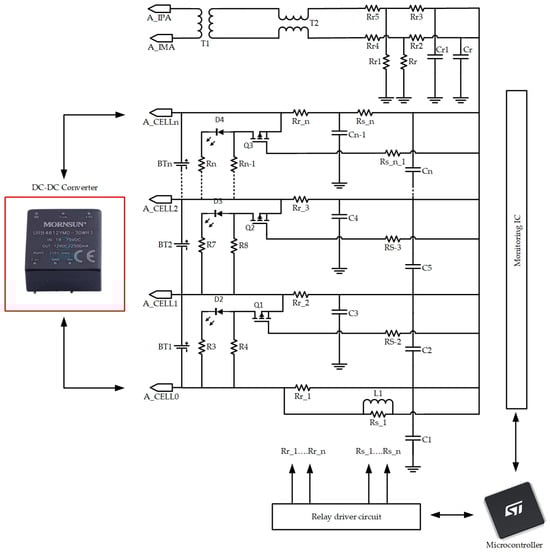 Figure 2 illustrates the cell-to-cell balancing circuit. Firstly, there are battery cells connected to each terminal of the converter to facilitate charger transfer. Secondly, there is a DC–DC converter (Mornsun, Guangzhou, China) tasked with transferring charge from a high-voltage cell to a low-voltage one. Lastly, there is a control circuit for monitoring IC for updating cell voltage and an STMicrocontroller responsible for managing converter and cell balancing.