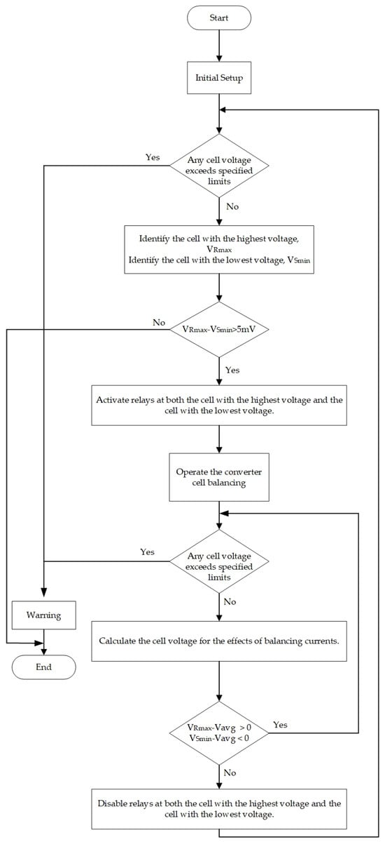 Figure 3 shows the algorithm method of cell balancing. Initially, the controller reads the voltages of all cells within the allowable range, VSmin, and the cell with the highest voltage, VSmax. Subsequently, the relay Rr_max, on the input side, is closed to connect the cell with VSmax to the converter’s input. While relay Rs_min, on the output side, is closed to connect the cell with VSmin to the converter’s output. This initiates the balancing process between these two cells immediately.