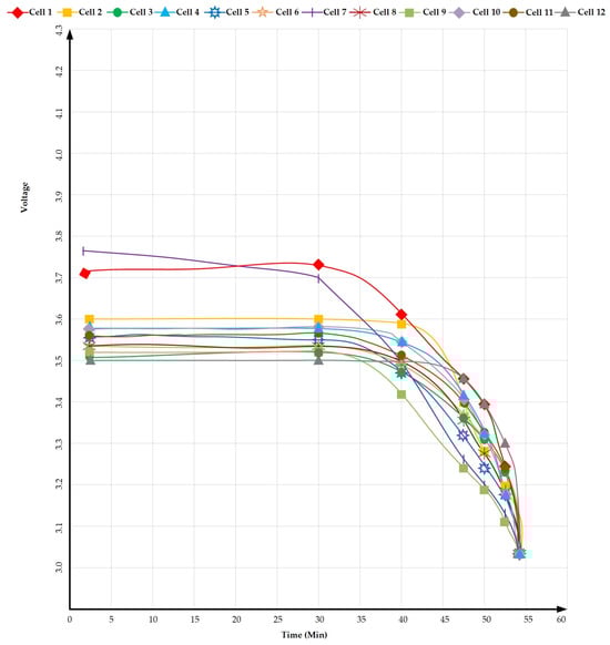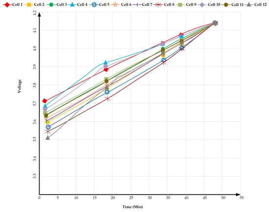 During the relaxation mode, the prototype circuit was tested with twelve cells in a battery string. Initially, the circuit detected that cell number 7 had the highest voltage at 3.78 V, while cell number 4 had the lowest at 3.6 V. Consequently, these two cells were prioritized for balancing. After 19 min, cell number 7 reached an average voltage of 3.705 V. Subsequently, the system identified cell number 6 as the new highest-voltage cell and cell number 8 as the lowest, initiating another round of balancing. This process continued until all cells reached an equilibrium voltage of 3.705 V, with a slight deviation of only 12 mV, achieved within 54 min.
