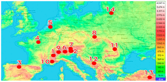 Spatial distribution of training and testing sites for global horizontal irradiance (GHI) prediction model. The map indicates terrain complexity with varying altitudes for each location. Map generated from the available source [33]. See Table 1 for the names of locations (1–14) and further data.