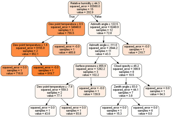 - The leaf node: A leaf node represents the endpoint of a branch in the tree. It signifies a terminal point where no further splits occur. Each leaf node contains the predicted GHI value for the subset of data that has traversed through the tree and arrived at that specific node. This prediction is based on a particular combination of inputs (e.g., air temperature, cloud opacity) and is calculated as the average GHI value derived from the actual GHI values of the samples in that subset. Leaf nodes serve as the final predictions made by the decision tree model.