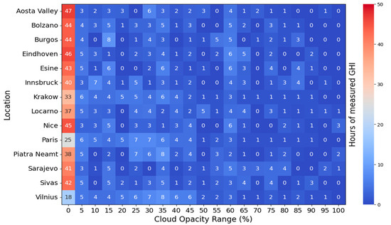 As can be seen in Figure 3, various locations across Europe exhibit notable similarities in terms of hours of GHI for training with corresponding cloud opacity values. In particular, the model tends to select GHI data for training related to clear sky days (transparent opacity). This preference is derived from the simplicity and predictability of clear sky conditions, which offer stable and consistent relationships between weather quantities (such as solar angles, air temperature, and humidity) and GHI [41]. Clear sky days have less noise and fewer confounding factors, allowing models to achieve lower error rates and better generalization on unseen data [41]. This phenomenon is consistent with findings that ML models often perform better on regular and less noisy data [42,43]. The predictability of GHI is significantly higher under clear sky conditions [44], supporting the preference for clear sky data points [44].