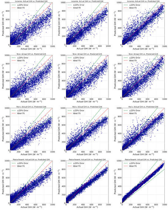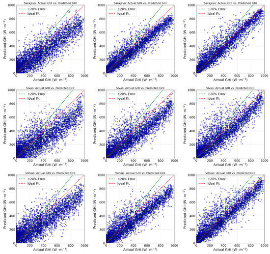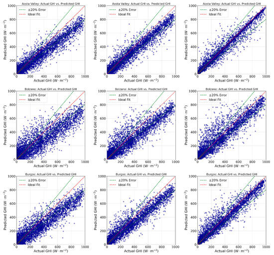 Moreover, the uncertainties associated with the measurements, particularly those from the utilization of first- and second-class pyranometers, can be analyzed to better understand the accuracy level of the model. Considering the theoretically achievable daily uncertainty of hourly GHI at a 95% confidence level, the first-class pyranometers typically have an uncertainty of around ±8% and second-class pyranometers an uncertainty of around ±20% [52]. The ability of the proposed model to minimize error rates even in the presence of such uncertainties underscores its robustness and reliability in predicting GHI accurately across varying atmospheric conditions.