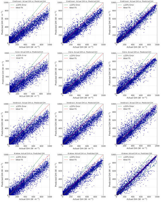 Conversely, the best distribution scenario exhibits a tighter clustering of data points around the line of perfect agreement. Here, the training dataset includes a higher proportion of clear sky days, improving the model’s ability to generalize and predict GHI values more accurately, thus reducing errors.