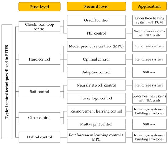 In 2015, a notable review by Yu et al. [5] on control strategies for Buildings Integrated with Thermal Energy Storage (BITES) exemplified the depth of research in this area. Following the categorization of control techniques derived by Afram et al. [6], reported in Figure 1, this review explored various control techniques, discussed their strengths and weaknesses, and anticipated the advancements in control methods that have emerged in recent years. The authors highlighted the potential of Model Predictive Control (MPC) and AI-based methods, which, although nascent at the time, have since been considered to be promising.