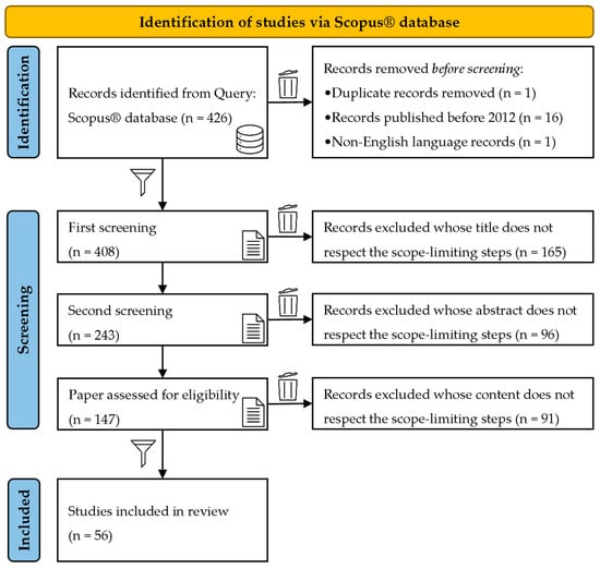 This extensive search yielded 426 papers, which were systematically filtered following the methodology outlined in Figure 2, similar to the approach used by Song et al. [13], adopting a PRISMA statement flowchart [14]. Initially, the identification pre-screening process resulted in a set of 408 papers. Title and abstract screening then reduced this number to 147 papers that were considered relevant to the scope of the review based on their abstracts and thus were included for further statistical description (Section 2.2) and analysis (Section 3.2). Subsequently, a full-text screening narrowed the selection to 56 papers that fully aligned with the review’s objectives. These papers were analyzed in greater detail in Section 3.3 and Section 3.4, providing the foundation for the discussion and future perspectives sections.
