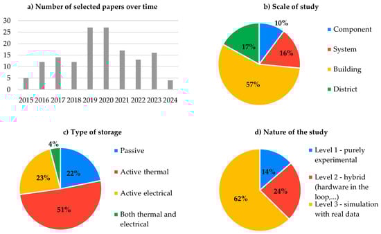 To comprehensively understand current trends in advanced storage control for optimizing energy systems in buildings and districts, a preliminary statistical analysis of the literature was conducted based on the year of publication, the scale of the study, the type of storage, and the nature of the study. These characteristics were selected to provide insights into the development of research over time, the scope and focus of studies, the variety of storage technologies examined, and the methodologies employed.