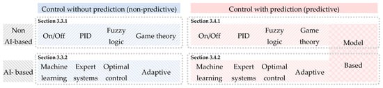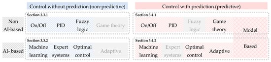 For most of the papers analyzed, it was possible to trace the control algorithms implemented by the predictive models back to the reference taxonomic categories, as shown in Figure 11. Most model-based predictive algorithms, when not using AI, implement on/off or PID strategies.