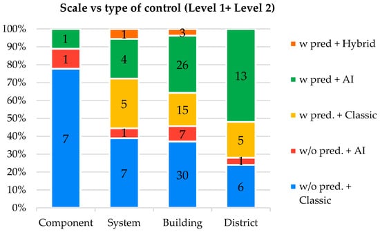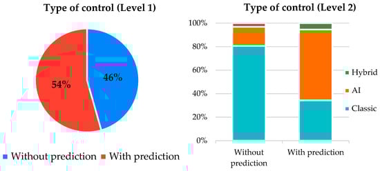 The previous classification of control methods is applied to the body of literature assessed for eligibility (147 papers), as depicted in Figure 5, Figure 6 and Figure 7. Figure 5 shows the distribution of papers according to the two levels of control types. For control without prediction, 85% of studies utilize classical control strategies, such as PID and on/off control. In contrast, 59% of papers involve control with prediction, with classic strategies employed in 35% of these studies. Notably, 60% of studies within predictive control adopt AI-based strategies, while the remaining 5% use hybrid methodologies that combine classical and AI approaches.