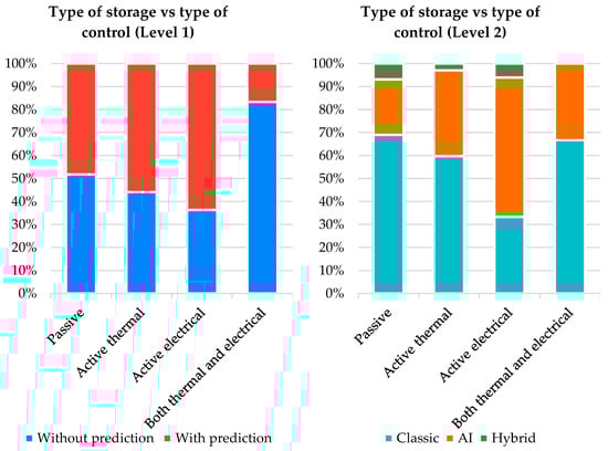 The relationship between the type of storage and the control methods employed is illustrated in Figure 6. Predictive control methods are predominantly used for active thermal and electrical storages. As we progress from passive to active storages, the reliance on classical control decreases, giving way to AI or hybrid control methods. This trend indicates a preference for more sophisticated control mechanisms as the complexity and dynamism of the storage system increase.