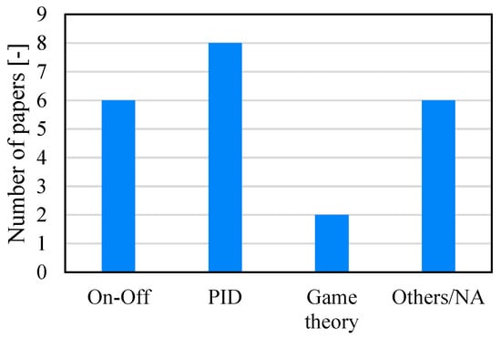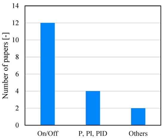 Among the papers that were analyzed, 18 papers used classical control techniques without prediction. Figure 8 shows the types of classical control used in the papers. Most of the studies implemented an on/off control, and two studies implemented P, PI, or PID controls (controllers using error dynamics). Some studies with on/off control adjusted their control setpoint based on criteria such as schedules [15], predefined curves [16], or energy prices [17].