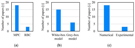 Paper distribution on the following: (a) MPC or RBC; (b) White-box model or grey-box model; (c) Numerical study or experimental study.