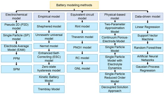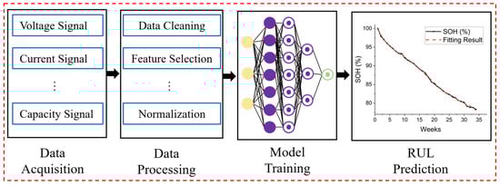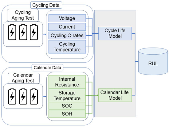 The computational complexity can be observed by the implementation of sophisticated diagnostic methods, such as Electrochemical Impedance Spectroscopy (EIS). EIS is considered a non-invasive method for analysing a battery’s increase in ohmic resistance. EIS provides detailed insights into the intrinsic electrochemical processes by employing alternating current perturbations across a range of frequencies and analysing the resulting impedance, making it an indispensable tool for real-time battery diagnostics [61]. This technique often identifies equivalent circuit model parameters that estimate battery states such as internal impedance, Li-Ion diffusion dynamics, electrode contact impedance, SOC, and SOH [61]. Nevertheless, the majority of commercial BMSs do not currently gather EIS data directly on the vehicle because of the expensive nature of the required equipment. Furthermore, the outcomes are susceptible to fluctuations in temperature, and the examination is laborious. In addition, the results are subject to variations in temperature and the test is time-consuming [62]. Therefore, a methodology for modelling batteries to predict their Remaining Useful Life (RUL) is showed in Figure 2.