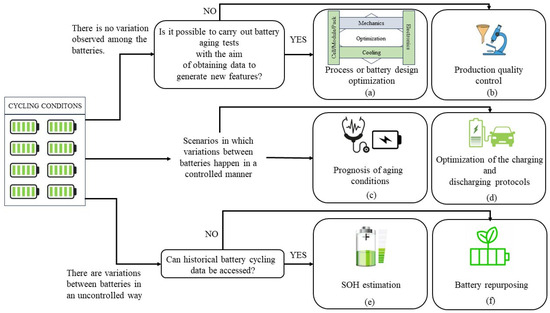 In terms of economic aspects, it is possible to estimate and reduce the return on the investment, identify new ways to capture the value, and maximise the value captured during the operation of batteries based on the degradation mechanisms. These systems can extend battery life and establish a market for second-life batteries [21,22]. From a research perspective, it is possible to identify the factors that accelerate batteries’ degradation, predict the moment of battery failure, identify new viable applications, and identify possible defects. Thus, it is possible to design new models and solutions to overcome the existing issues [20]. Automating battery disassembly and categorisation requires an in-depth understanding and accurate models of secondary-life battery degradation. Therefore, a clearer understanding of battery degradation will enable the development of technologies focused on reducing the time and cost associated with battery disassembly and sorting [23]. This method reduces or eliminates the need for exhaustive battery testing, thereby enhancing the overall efficacy of battery lifecycle management [24].