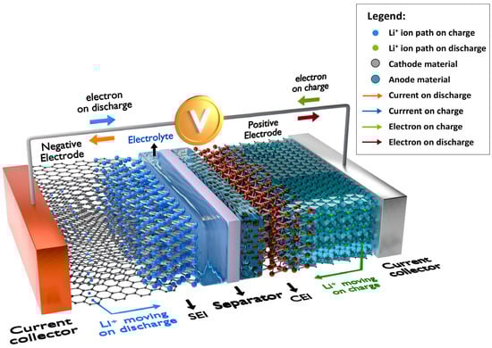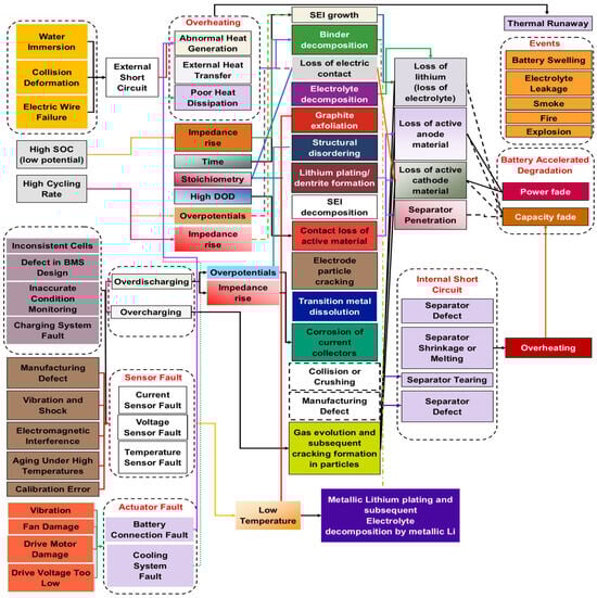 Regarding the battery systems applied to EVs, LIBs are the most used because of their advantages, including high specific energy, low self-discharge, extended lifespan, safety, and cost [14,15,16,17]. During the operation of EVs, the batteries suffer from various degradation mechanisms that depend on numerous factors (e.g., road conditions, driver behaviour, ambient temperature, and cabin temperature) [3]. These degradation mechanisms can reduce battery capacity and power, resulting in a shorter EV range, which may cause range anxiety in customers. Furthermore, accelerated battery degradation also reduces charging and discharging efficiency, increasing internal resistance and shortening the battery’s lifetime [18].
