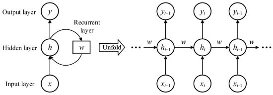 Recurrent neural networks (RNNs) are a class of deep neural network designed for processing sequential data. They have been widely utilized in various fields, such as natural language processing, image recognition, and time series forecasting [25,26,27]. Unlike conventional feedforward neural networks, RNNs are capable of retaining and utilizing past information when processing sequential data, making them well suited to handling temporally dependent data. An RNN is a fully connected neural network with self-recurrent feedback, as illustrated in Figure 1.