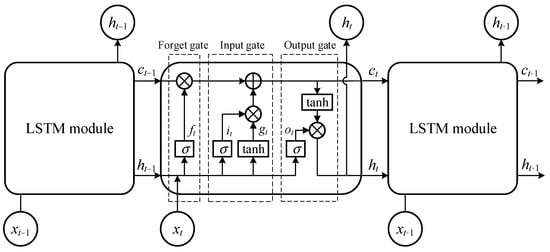 Conventional RNNs have limited ability to capture long-term dependencies due to issues with vanishing or exploding gradients during training lengthy sequences. To address this problem, the long short-term memory network (LSTM) was developed as a specialized type of RNN [28,29]. The LSTM has been widely used for processing sequential data and has found application in various domains of vehicle emission prediction. As shown in Figure 2, the LSTM is equipped with three unique “gate” structures within the neurons. These “gate” structures enable the addition and removal of information, facilitating the flow of states for long-term memory retention. Each LSTM cell contains three “gate” structures: input gate it, forget gate ft, and output gate ot to manage the flow of information.