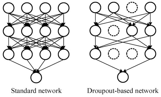 Overfitting is an important problem in multilayer LSTM models. Multilayer LSTM model training and learning is essentially optimization and generalization. Debugging the multilayer LSTM model parameters minimizes the loss function value in the training sample set. The performance of a fully trained predictive model in the test sample set reflects the model’s generalization capabilities. Overfitting can affect the training model’s performance and thus reduce generalization. To prevent models such as multilayer LSTM neural networks from overfitting the training sample set, regularization techniques are adopted to limit the complexity of the model. A regularization term for the model parameters is added to the objective function. The dropout method is one of the most effective regularization tools for deep learning [30], and the standard network and the dropout-based network are shown in Figure 3.