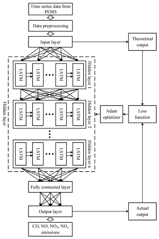 In general, the methods used to measure vehicle emissions include chassis and engine dynamometer testing [11], road tunnel measurements [12], optical remote sensing systems [13], plume chasing measurements [14], and portable emission measurement systems (PEMSs) [15]. In recent years, PEMSs have been utilized to measure the emission characteristics of off-road mobile machinery, proving to be an effective method for characterizing the actual emissions levels [16,17,18]. To accurately assess the pollution emissions from mobile machinery on actual roads, researchers have proposed various deep learning models for predicting mobile machinery emissions. Singh and Dubey [19] proposed an LSTM-based CO2 emission prediction model that can utilize vehicle onboard diagnostic (OBD) port data for the remote emission monitoring of vehicles. Yu et al. [20] introduced a method for the accurate prediction of nitrogen oxide emissions from diesel vehicles using adaptive noise (CEEMDAN) and long short-term memory (LSTM) networks. Shin et al. [21] presented an LSTM-based emission prediction model for the accurate forecasting of transient NOx concentrations in diesel engines. Zhang et al. [22] developed a time series model based on wavelet transform and LSTM networks to predict engine emissions, including CO, HC, and NO emissions. Wang et al. [5] utilized a PEMS to measure and analyze the exhaust pollutant emission characteristics of engineering machinery under different operating conditions. Zhang et al. [23] utilized PEMS and global positioning system (GPS) data to investigate vehicle emission characteristics and developed an LSTM-based model for predicting carbon dioxide emissions. Xie et al. [24] proposed a parallel attention-based LSTM emission prediction model integrating PEMS and OBD systems.