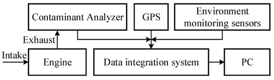 Portable emissions measurement systems (PEMSs) can evaluate engine emissions by conducting real-time tests and provide instantaneous emissions, fuel consumption, vehicle speed, temperature, and other parameters based on the equipment capabilities. The data obtained from the analysis of engine exhaust gases by various analyzers within PEMS, in conjunction with environmental and GPS parameters, are input into the data acquisition system and ultimately recorded and stored in a PC. The process of exhaust gas sampling and data processing by PEMS is shown in Figure 5.