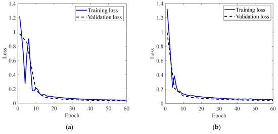 The PEMS test data from four different types of off-road construction vehicles were utilized to train and analyze using the method presented in this paper. Figure 7 shows the training and validation losses of the proposed model with a loss function. The LSTM models for forklifts, loaders, tractors, and forklifts reached their minimum training losses at the 50th, 40th, 60th, and 40th epoch, respectively, while achieving their minimum validation losses at the 40th, 40th, 60th, and 60th epoch, respectively. These results indicate that the final models were not over-fitted, and their accuracies were optimized.