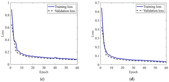 Training and validation losses according to the epoch: (a) forklift; (b) loader; (c) tractor; (d) excavator.