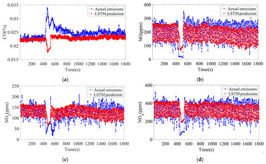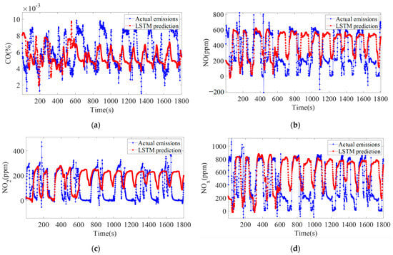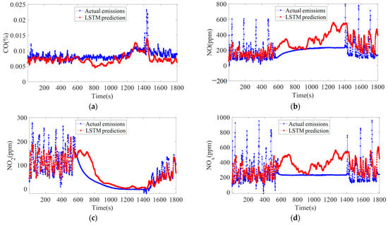 Emission prediction results of an excavator using the LSTM model: (a) CO; (b) NO; (c) NO2; (d) NOX.