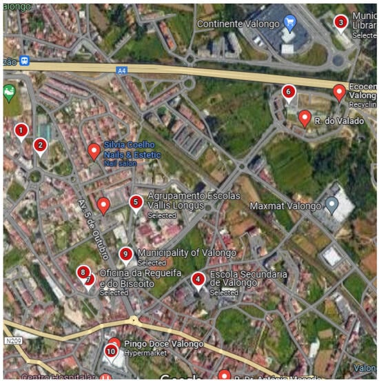 The analyzed renewable energy community is planned to be implemented in Valongo, Portugal. The community comprises a total of fourteen municipality-owned buildings (Figure 1), namely the following: (1) a sports center, (2) a pool, (3) a library, (4) a high school, (5) Vallis Longus school, (6) Valado school, (7) Biscoito and Regueifa museum, (8) Biscoito and Regueifa restaurant, (9) a municipal museum, and (10) EV chargers. Among these buildings, Valado school, the municipal pool and the library received PV installations for self-consumption at the end of 2022. In addition, some of the remaining facilities can also be considered for future PV installations and operate as prosumers. Finally, the existing EV charging stations can be used as storage and to exploit demand side flexibility.