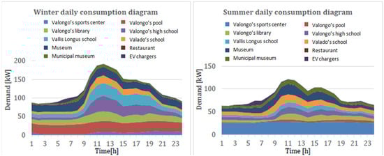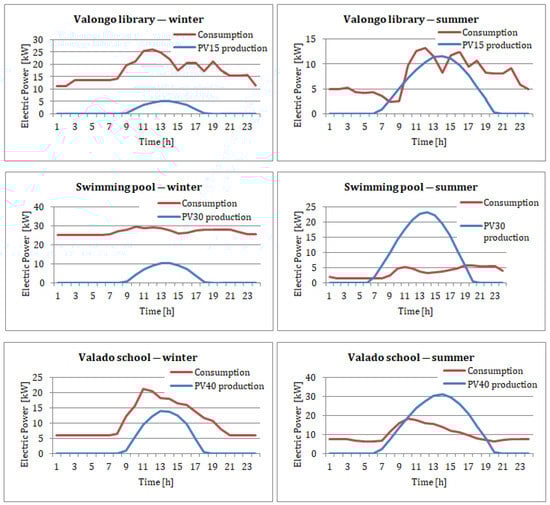 Figure 11 shows individual load and PV diagrams of three locations that have photovoltaic systems. It can be seen that the swimming pool has excess electric energy during summer. On average, this energy is around 140 kWh/day. Valado School has less excess electric energy on an average summer day, around 100 kWh/day. This energy will be injected back to the grid to other community consumers. In summer, the library’s PV system matches the consumption, leaving no excess electric energy. In winter, all of the systems consume their entire PV production.