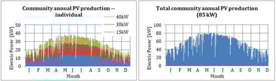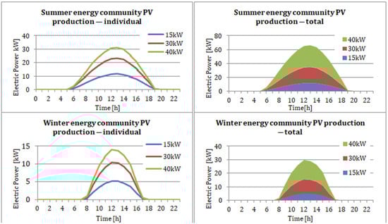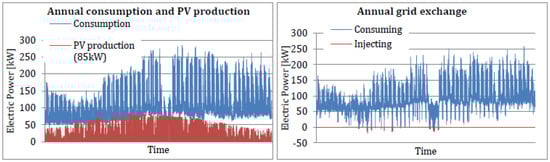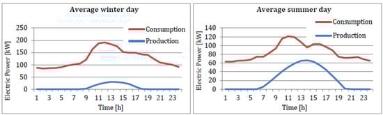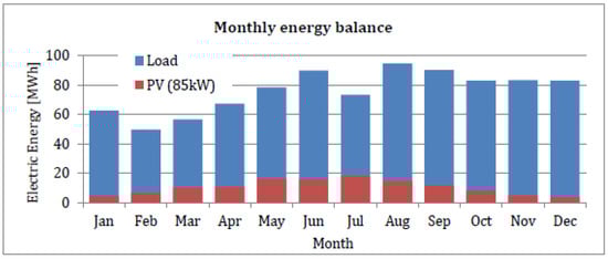 Electric energy balance is one of the most important analyses to show the adequacy of PV installation size, battery size, production–consumption correlation, and energy exchange with the utility grid. Additionally, this analysis is very important for further economic analysis and optimization of the energy community system. Figure 8, Figure 9 and Figure 10 represent electric energy balance results considering the existing 85 kW horizontally placed PV system. Only on rare occasions is PV production higher than the load; therefore, the installation of a battery system is not justified. It is concluded that the PV system reduces the consumed grid energy from 915 MWh/year to 785 MWh/year. Considering the pricing model given in Figure 7, the planned PV system of 85kW can save up to 26.000 EUR/year.